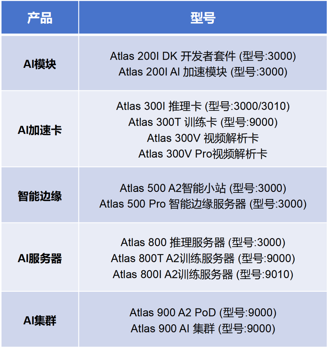 基于昇腾芯片,华为开发了 AI 算力板卡、服务器、集群等一系列硬件产品,如下图所示: