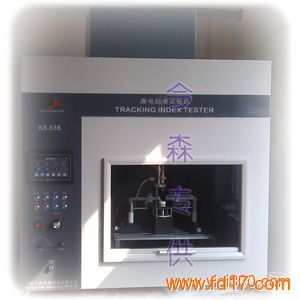 漏电起痕试验仪 是在固体绝缘材料表面上,在规定尺寸 ( 2mm × 5mm ) 的铂电极之间,施加某一电压并定时 (30s) 定高度( 35mm )滴下规定液滴体积的污染液体 (0.1%NH 4 CL),用以评价固体绝缘材料表面在电场和污染介质联合作用下的耐受能力,测定其相比电痕化指数 (CT1) 和耐电痕化指数 (PT1) 。