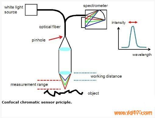 传感器操作根据共焦色传感器原理: 为有一个好的映射能力,白光点光源使用透镜系统聚焦在样品,但一个强大的线性彩色误差(多色差透镜系统)。每种颜色有不同的焦距。从样品的反射光通过一个针孔聚焦到光谱仪。因为只有一个特定的颜色是聚焦在样品表面,因此只有这种光可以通过共焦针孔。因此检测波长就可得到表面形貌。